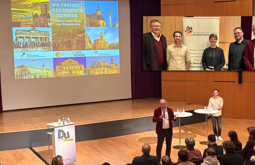 Die Nachmittagsveranstaltung wurde von Mirko Drotschmann („MrWissen2go“) moderiert, der zuvor für etliche Selfies herhalten musste. Bei der Veranstaltung selbst wirkten als Impulsgeber Stefan Brauburger (Leiter Redaktion Zeitgeschichte beim ZDF), David Barth (Stiftung Orte der Demokratiegeschichte) und Niko Lamprecht mit. Letzterer erläuterte die Lehrkraftperspektive auf Exkursionen und Erinnerungsorte, die „als Sahnehäubchen“ und wichtige Unterrichtsergänzung anzusehen seien, aber durchaus Organisationsaufwand und manchmal Frustrationserlebnisse (aufgrund von Nichtgenehmigungen, Geldmangel o.ä.) bedeuten. Der VGD wünscht sich hier eine Bürokratieentlastung und ein einheitliches Fördersystem, damit Schulen proaktiv ein Budget erhalten, aus dem dann – ohne viele Anträge, Finanzengpässe etc. – gewollte Gedenkstättenbesuche oder historisch-politische Exkursionen bedient werden können. Die Schülerschaft rief er auf, dem Thema Demokratiegeschichte Aufmerksamkeit zu widmen: „Ihr seid die Zukunft in unsicheren Zeiten, nutzt geschichtliche Orte dieser Art, überprüft Eure eigene Verortung und den Wert von Demokratie!“ Markus Rindt wiederum trat als Zeitzeuge der DDR-Wendezeit auf und konnte authentisch von seiner Flucht aus der DDR über die Prager Botschaft im Oktober 1989 berichten: „Ich wollte nur Freiheit, alles andere war mir egal“.